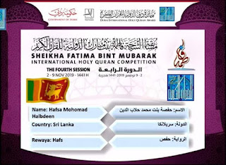 وتمثل جمهوريةَ سريلانكا المتسابقة حفصة بنت حلاب الدين للمشاركة في “فئة حفظ القرآن الكريم كاملا“.